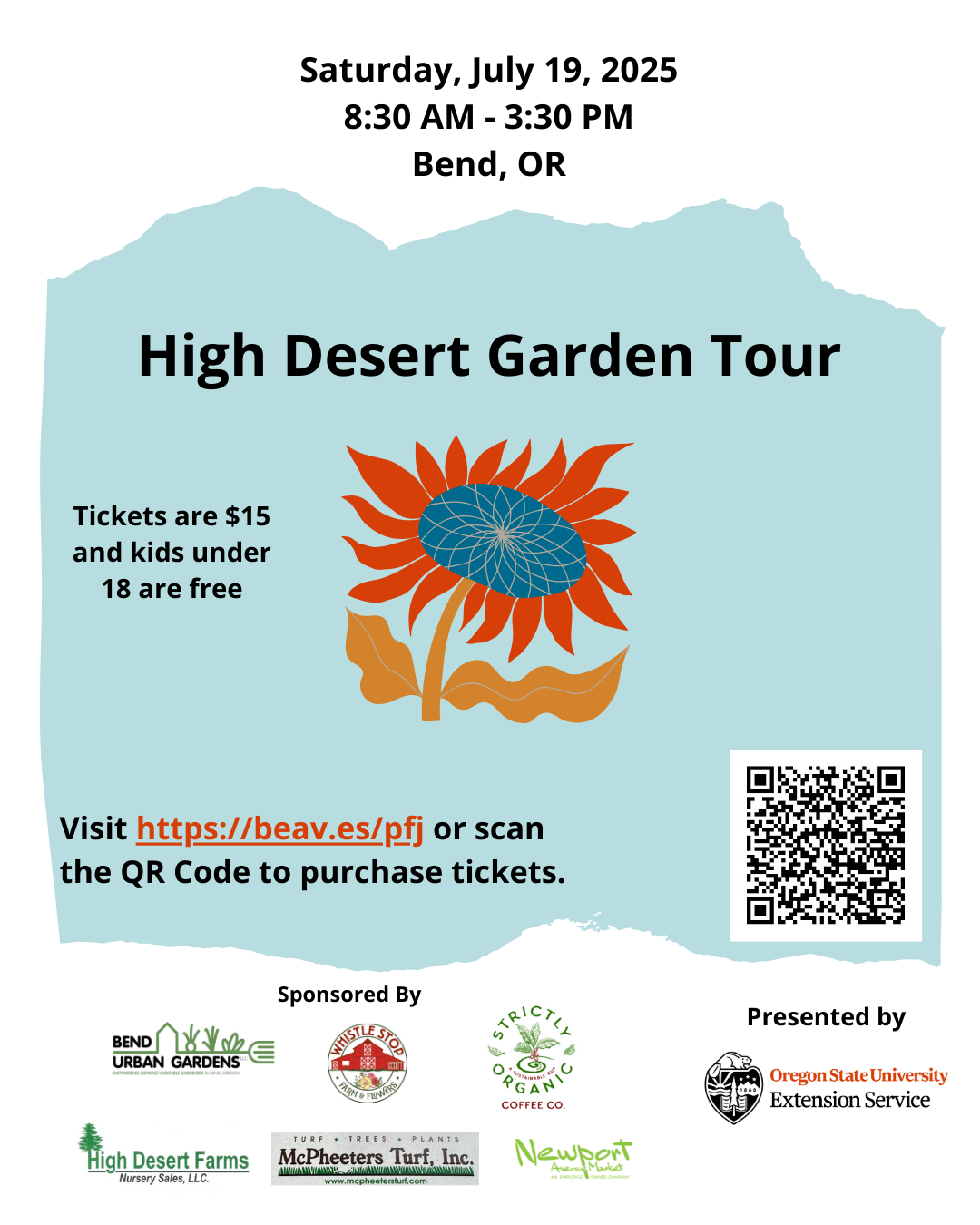Join us Saturday, July 19th, for the 30th Annual High Desert Garden Tour, presented by OSU Extension Service and OSU Master Gardeners™. This is a self-guided tour of 6 beautiful gardens in the Bend area. This year’s tour features a wide variety of garden styles including a cut flower farm, waterwise landscaping, and a community garden. Call 541-548-6088 for more information or visit https://beav.es/HDGT2025 to buy tickets. Tickets are $15. Children under 18 are free.