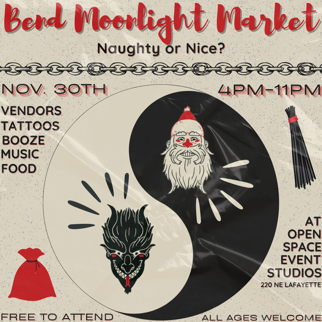 Naughty or nice, we don’t judge at Bend Moonlight Market 😉 Come indulge in the best vendors, food, music, and tattoos while supporting small businesses on #SmallBusinessSaturday.