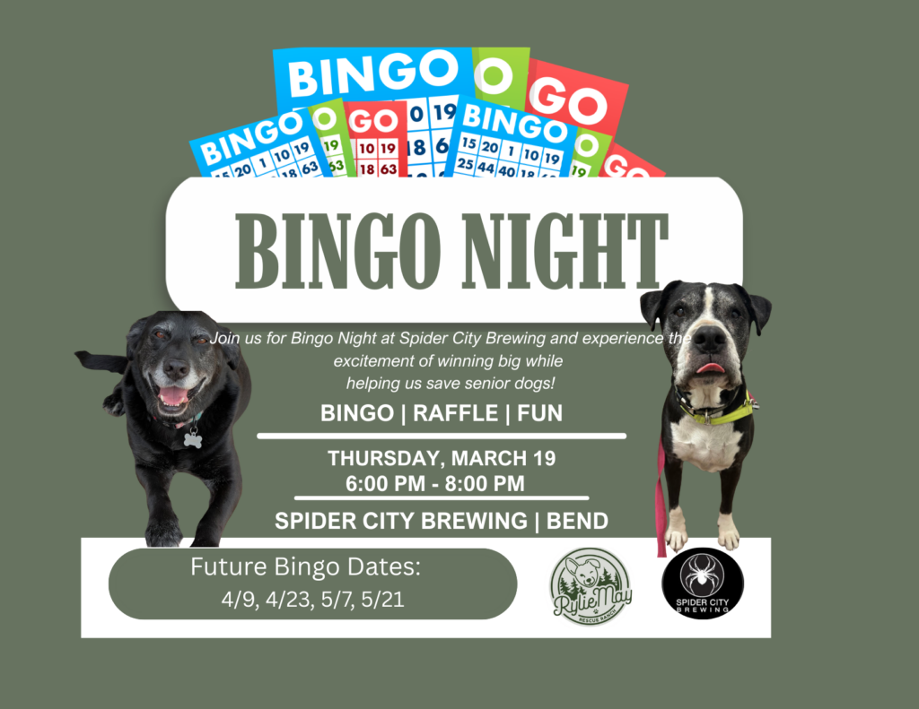 Please join RylieMay Rescue Ranch and Spider City Brewing for an evening of bingo. There will be raffle prizes and Spider City will graciously be donating $1 from all drink purchases to our cause. RylieMay Rescue Ranch is a non-profit focused on rescuing senior dogs from unsafe and high kill shelters. We provide a loving environment for senior dogs to live their golden years with the love they’ve always deserved.