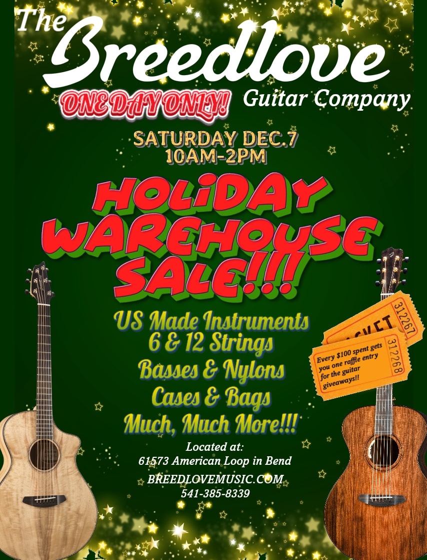 Bend, Oregon – Gear up for the holidays at the Breedlove Guitar Warehouse Sale on Saturday, December 7th, from 10 AM to 2 PM at 61573 American Loop. Just in time for the season, this event follows Black Friday and offers the perfect opportunity to find a meaningful gift for the musicians in your life.