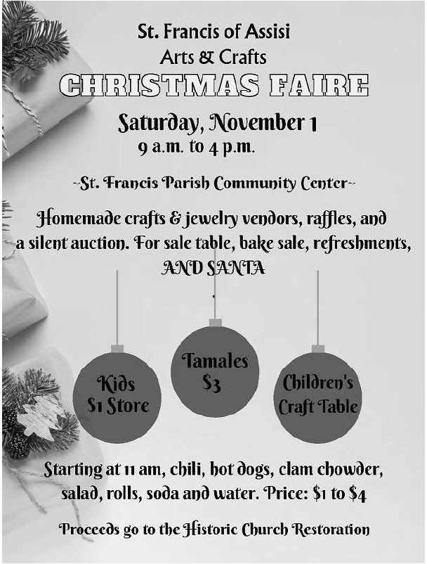 Arts & Crafts Christmas Faire at St. Francis of Assisi Catholic Church Community Center. Homemade crafts and jewelry vendors, raffles and a silent auction. Bake Sale, Refreshments and Santa