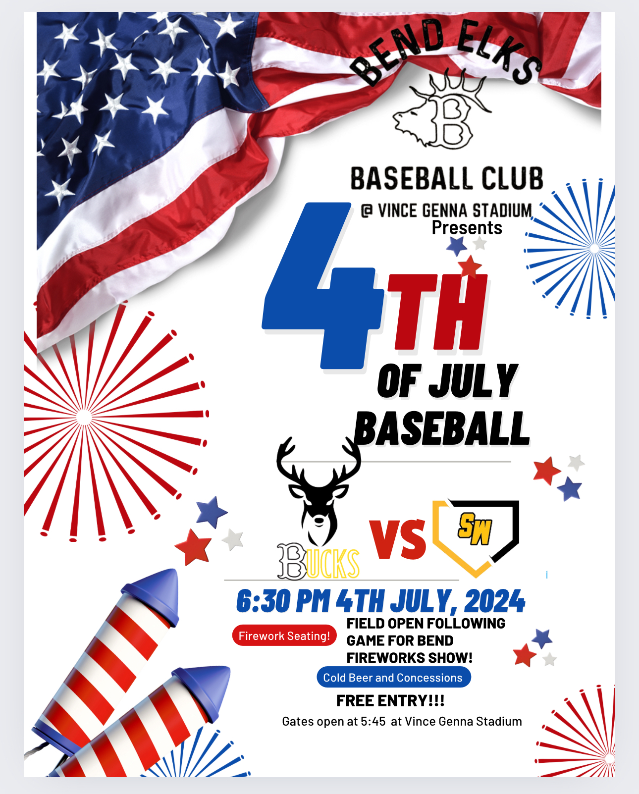 The Bend Bucks take on the Sunwest Generals in a college baseball matchup! The field will be open for seating following the game to view the fireworks in Bend! Concessions will be open and tickets are free!
