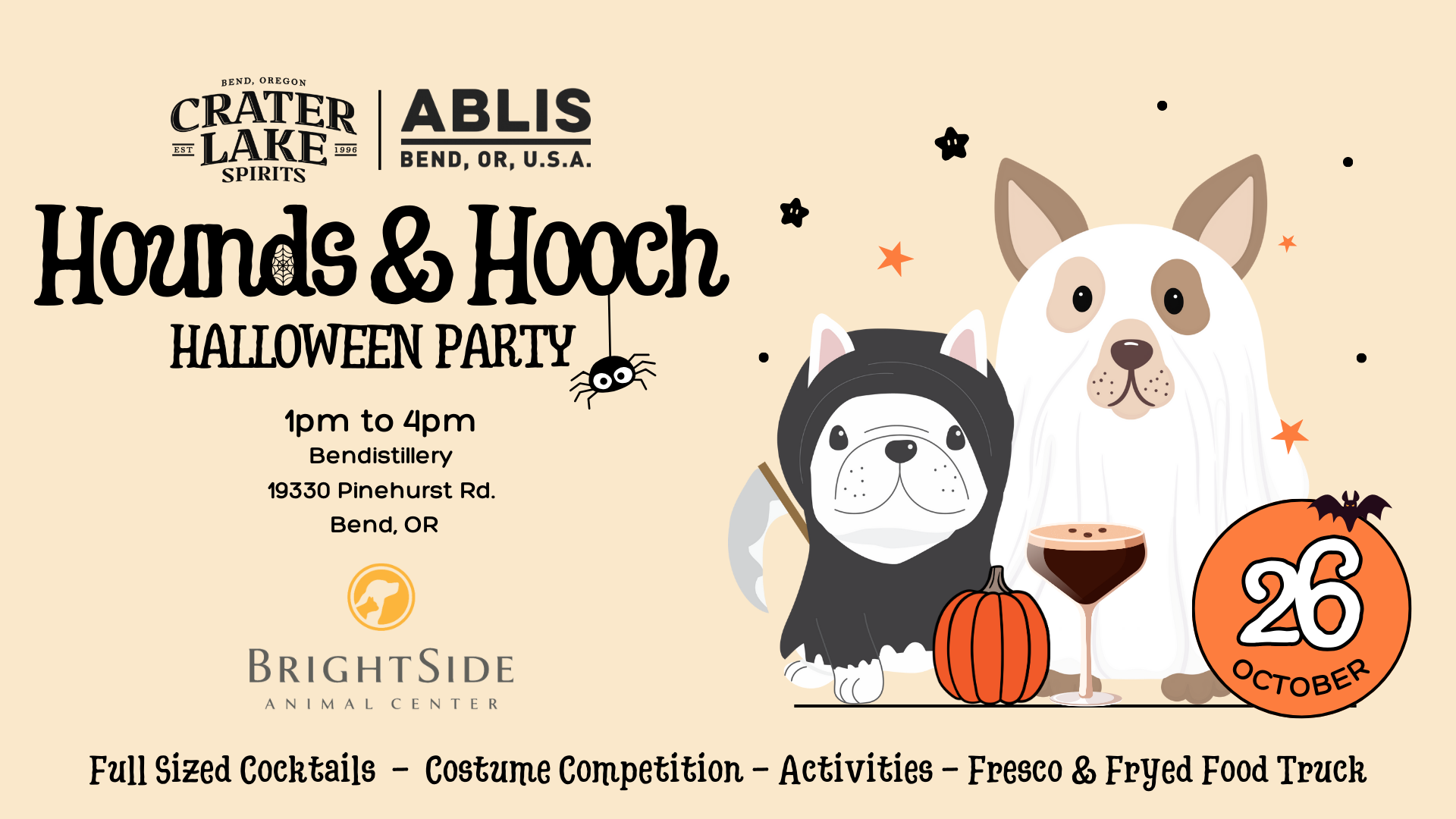 Join us for the Hounds and Hooch Halloween Costume Party at Crater Lake Spirits Tasting Room on Saturday, October 26th, from 1:00 PM – 4:00 PM!