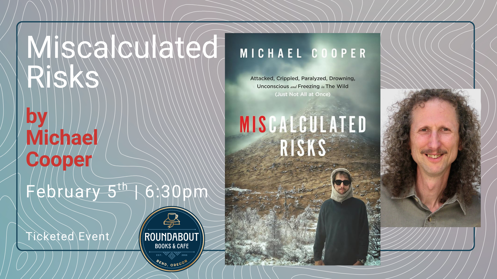 Join Bend author and adventurer Michael Cooper to discuss his 2025 American Writing Awards’ Best New (Debut) Non-Fiction winning book, Miscalculated Risks: Attacked, Crippled, Paralyzed, Drowning, Unconscious and Freezing in The Wild (Just Not All at Once).