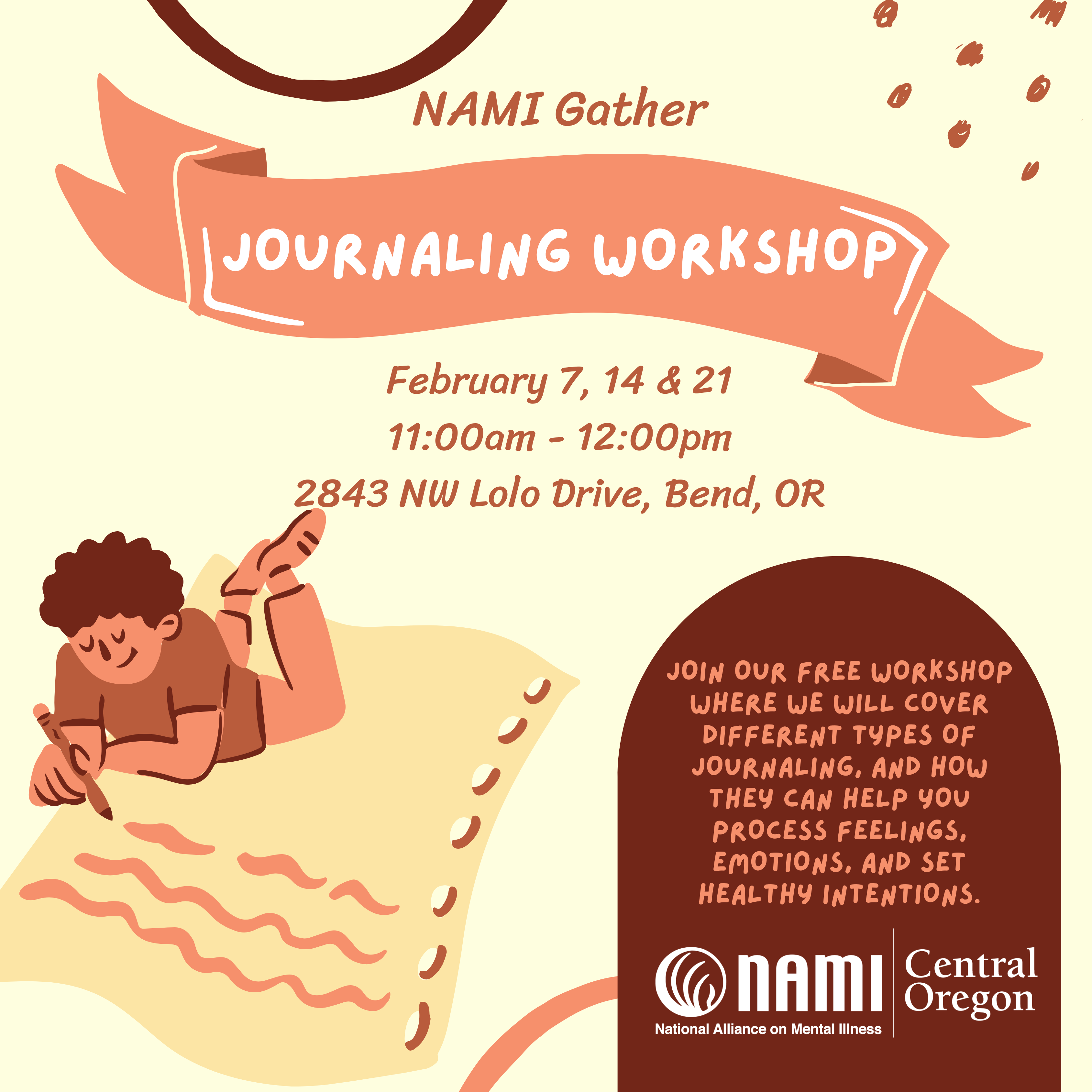 Join us for a NAMI Gather Journaling for Mental Health drop-in workshop series on February 7, 14 & 21 at the NAMI Central Oregon headquarters at Embark Coworking Space, 2843 NW Lolo Dr, Bend, OR 97703! Please RSVP here