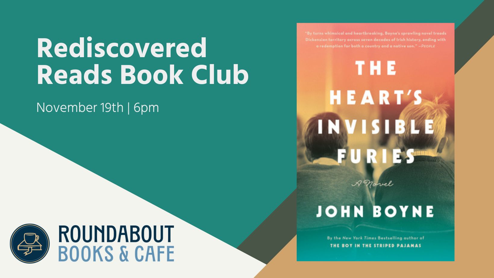 Nov 19 – The Heart’s Invisible Furies by John Boyne. (Note we’re meeting one week earlier to avoid holiday conflict)