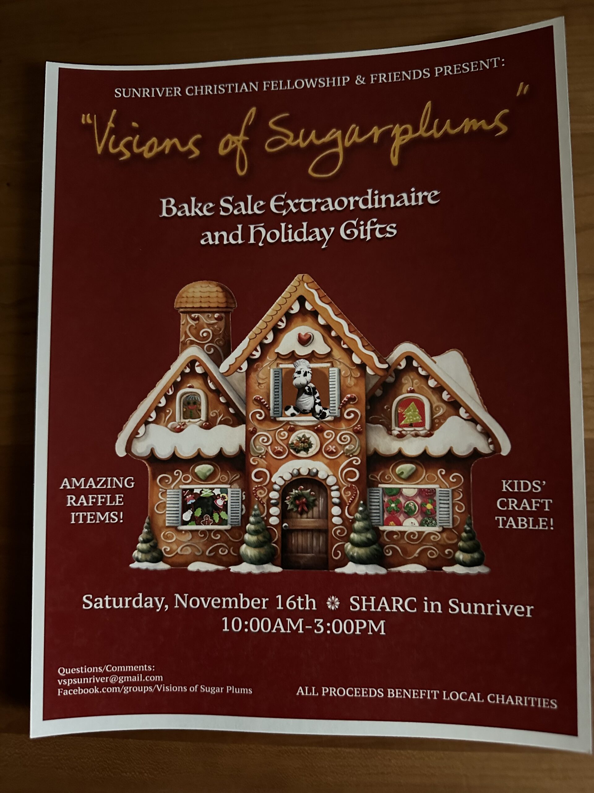 We will have a children’s activity table to keep the little ones entertained while adults are shopping. To see pictures of the many amazing items join our Facebook page, Facebook.com/groups/VisionsofSugarPlums or email us at vspsunriver@gmail.com with any questions or comments.
