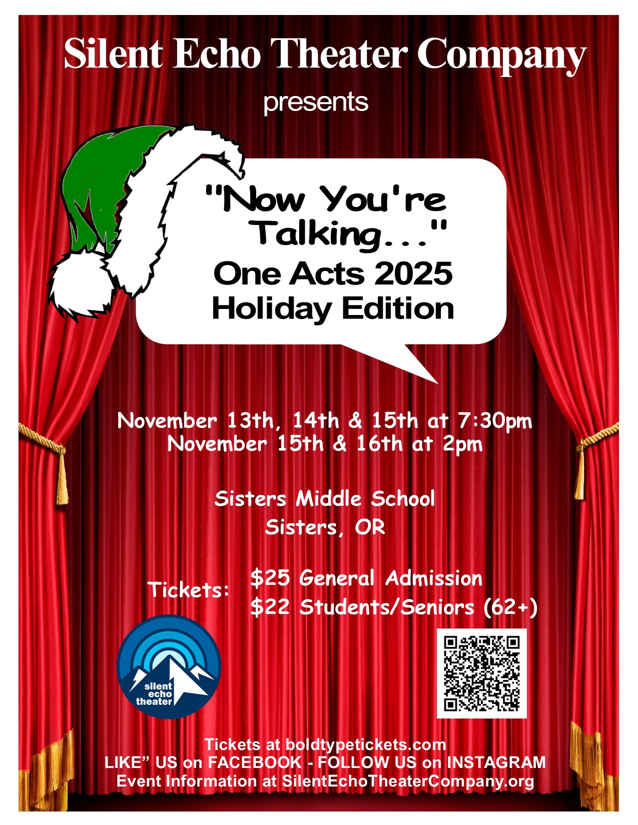 Silent Echo Theater Company will present “Now You’re Talking...” One-Acts 2025 Holiday Edition taking place November 13-16 at Sisters Middle School, 15200 McKenzie Hwy, Sisters OR. The evening will feature seven holiday one-acts. The actors and directors are from Sisters, Bend, Redmond and Terrabonne. Performances will take place Thursday-Saturday at 7:30 p.m. with a 2 …