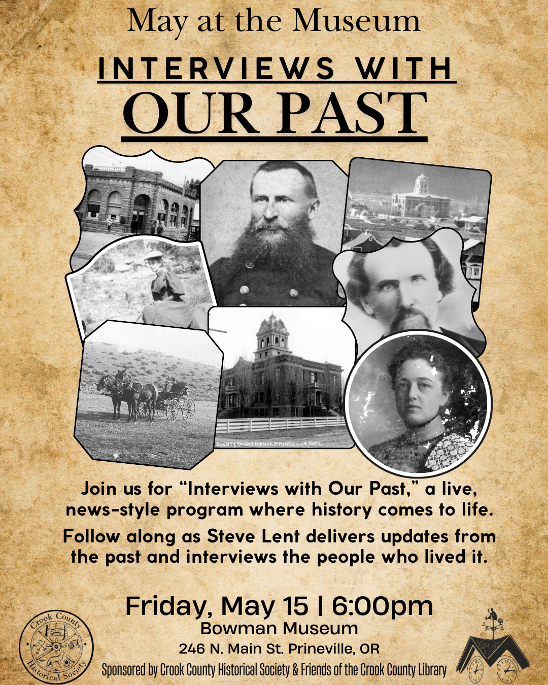 Join us at the Bowman Museum on Friday, May 15 at 6:00 PM for “Interviews with Our Past,” a one-of-a-kind program that brings local history to life through a live, news-style broadcast. Serving as the evening’s “news anchor,” Steve Lent will guide you through key moments in Prineville and Central Oregon’s early days—sharing updates from …