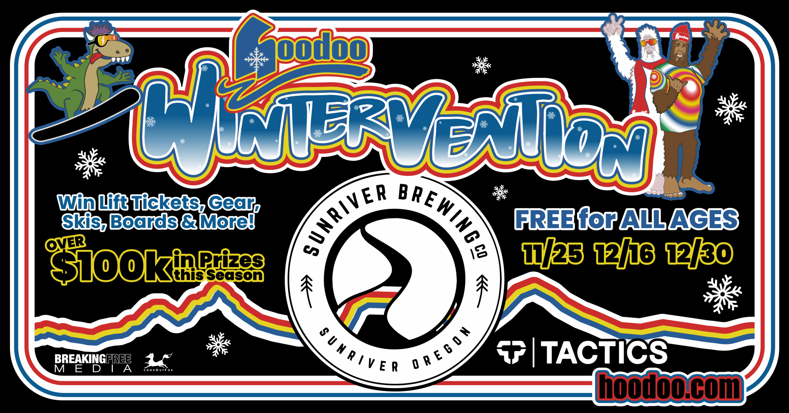 SunRiver Brewing-Eastside 1500 NE Cushing Dr, BendHoodoo’s about to have a Wintervention...You snooooow ready? It’s the deepest Snow Series Giveaway in the Northwest and it’s coming to a venue near you!!! Hoodoo’s dumpin’ over 100K in prizes this season...lift tickets,skis,boards, gear, snow and more. Games, Trivia, Movies, Bloopers and antics hosted by Harold the Hodag and his friends Yeti and Sas...Get …