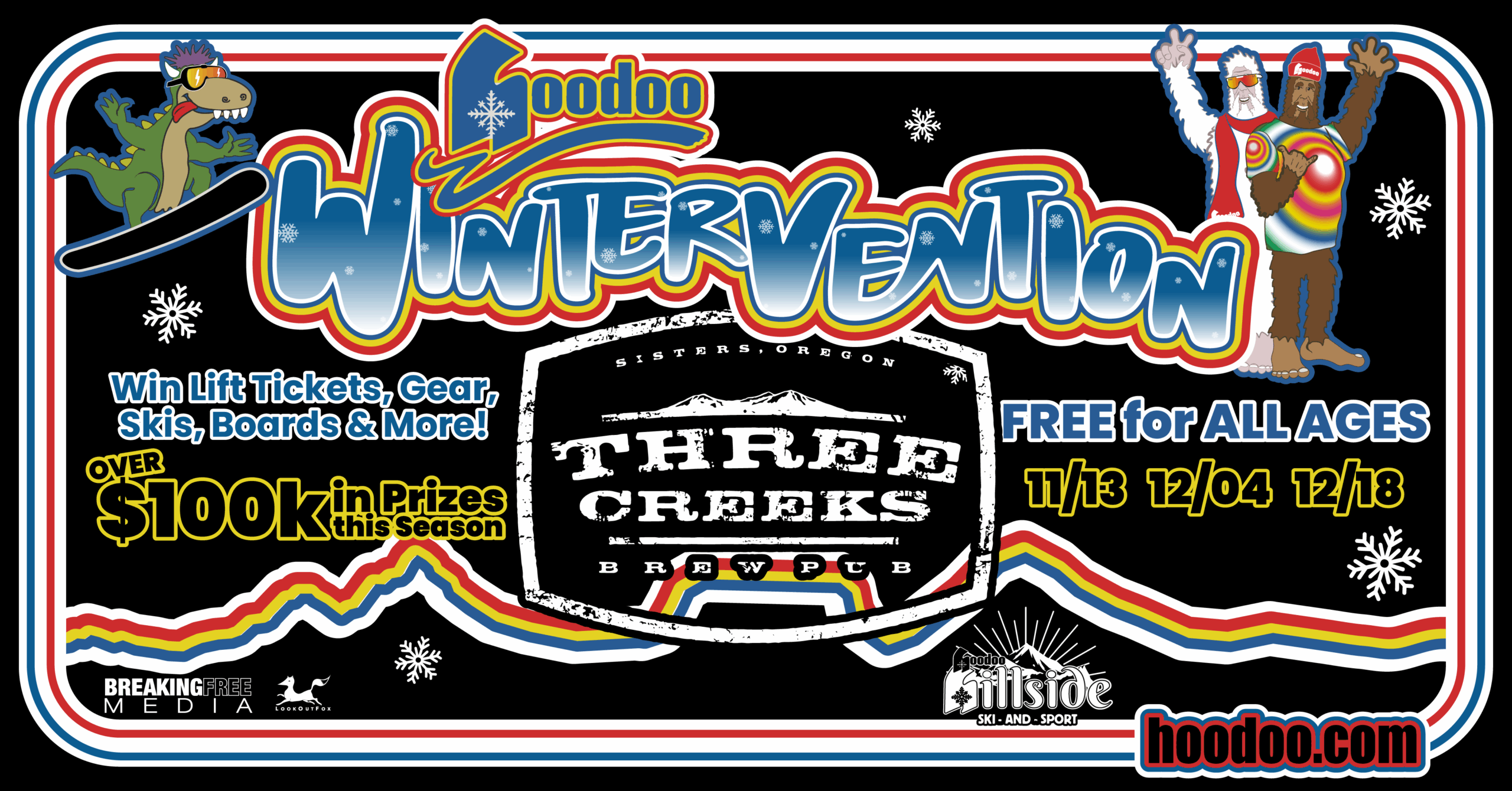 Three Creeks Brewing Co. 721 S. Desperado Ct., SistersHoodoo’s about to have a Wintervention...You snooooow ready? It’s the deepest Snow Series Giveaway in the Northwest and it’s coming to a venue near you!!! Hoodoo’s dumpin’ over 100K in prizes this season...lift tickets,skis,boards, gear, snow and more. Games, Trivia, Movies, Bloopers and antics hosted by Harold the Hodag and his friends Yeti and Sas...Get …